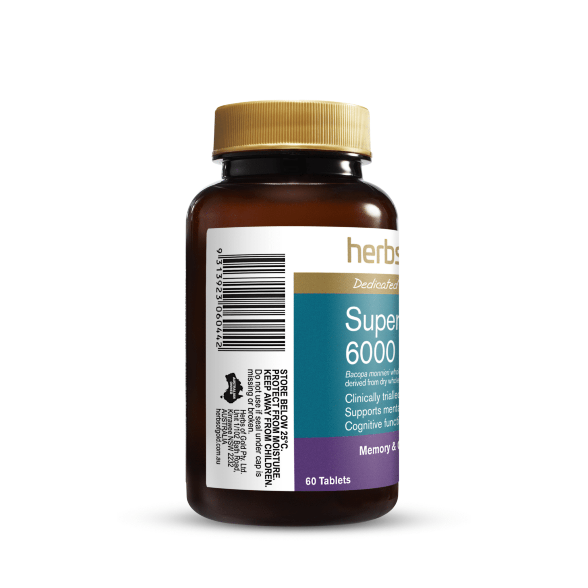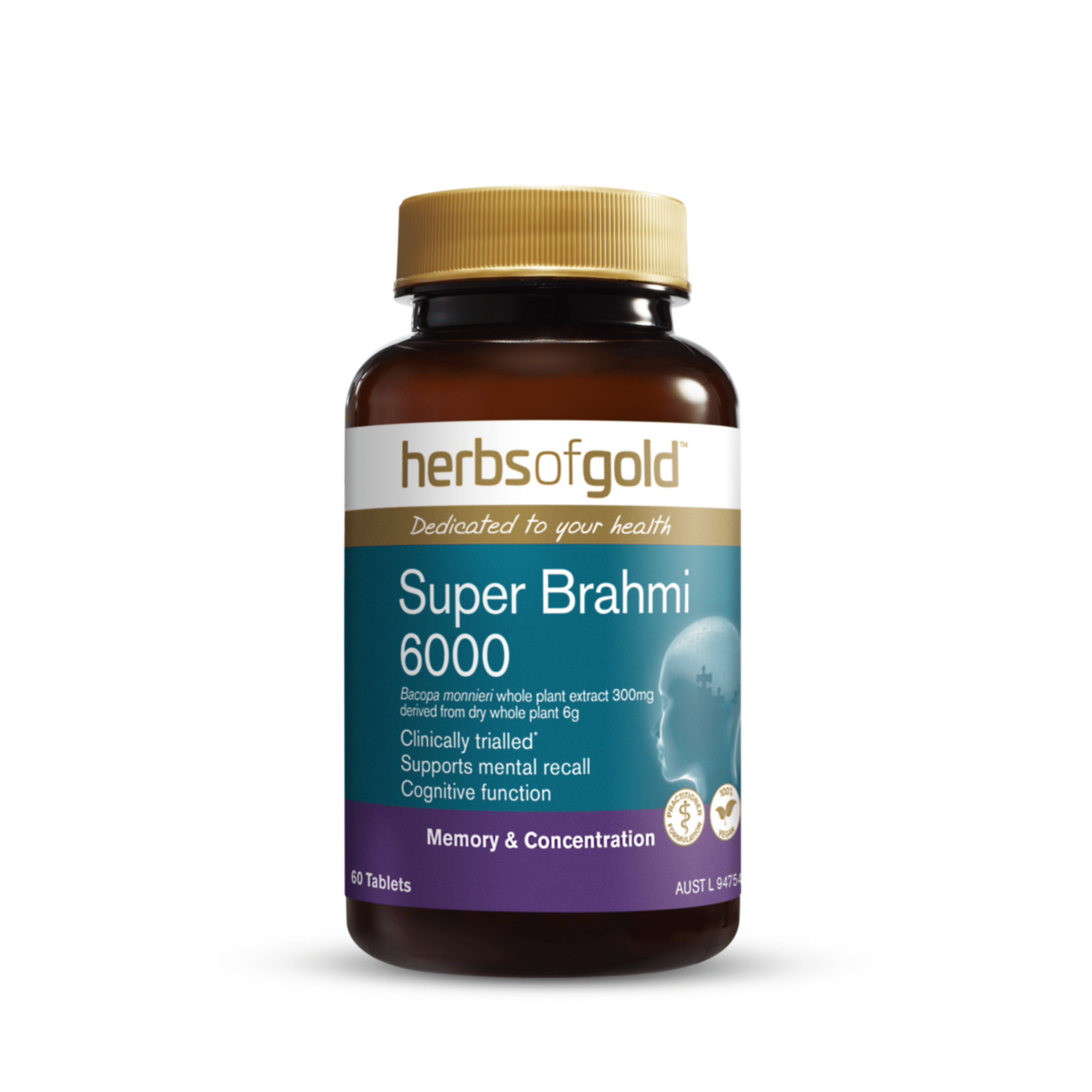 Herbs of Gold Super Brahmi 6000 contains BacoMind®, a **clinically trialled** extract of **Bacopa monnieri**, designed to **support cognitive function, memory recall, and mental clarity.** This high-strength formula helps improve **learning ability** and supports **nervous system health.**
