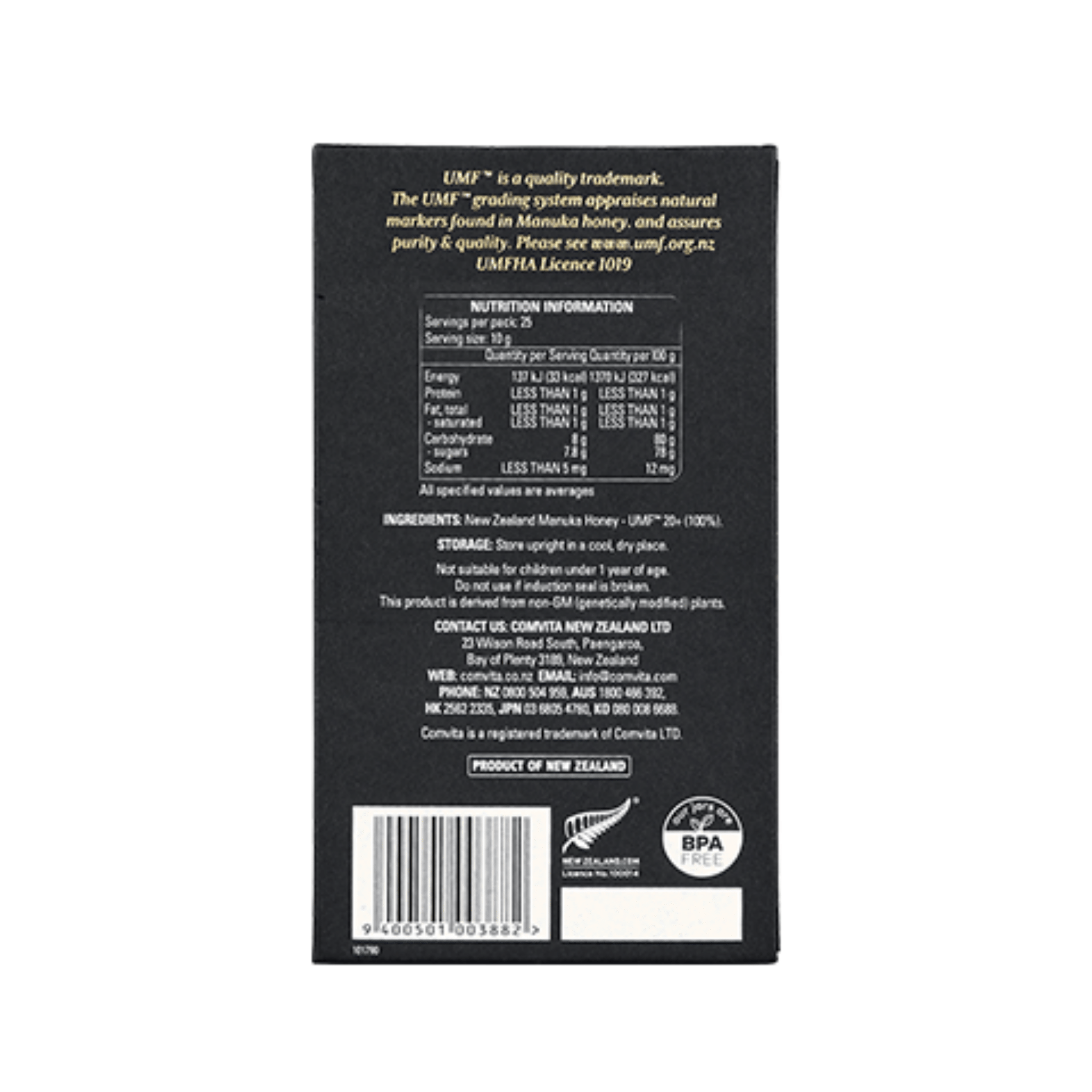 - 100% **New Zealand Manuka Honey**, backed by the **UMF™ quality guarantee**.