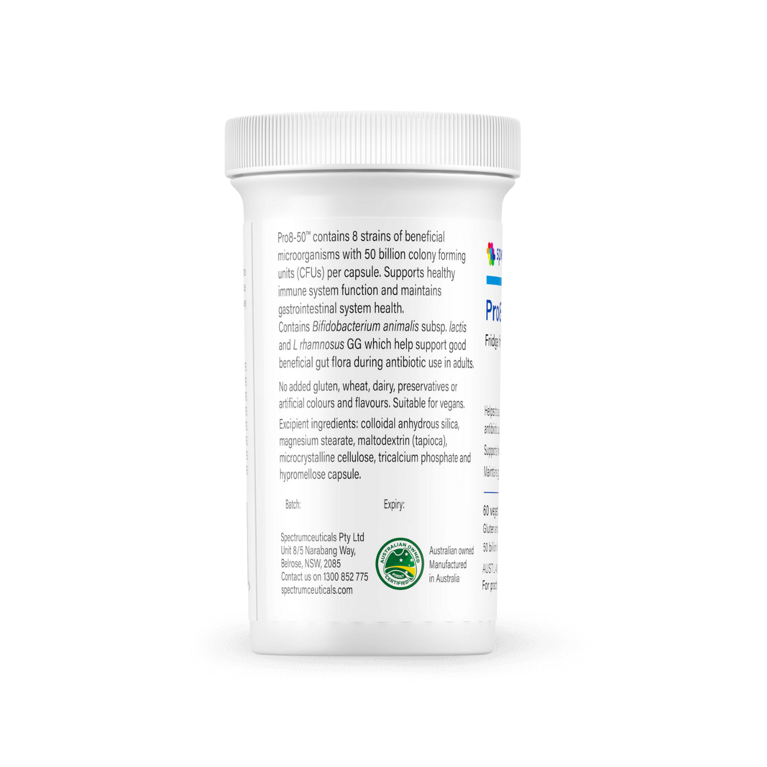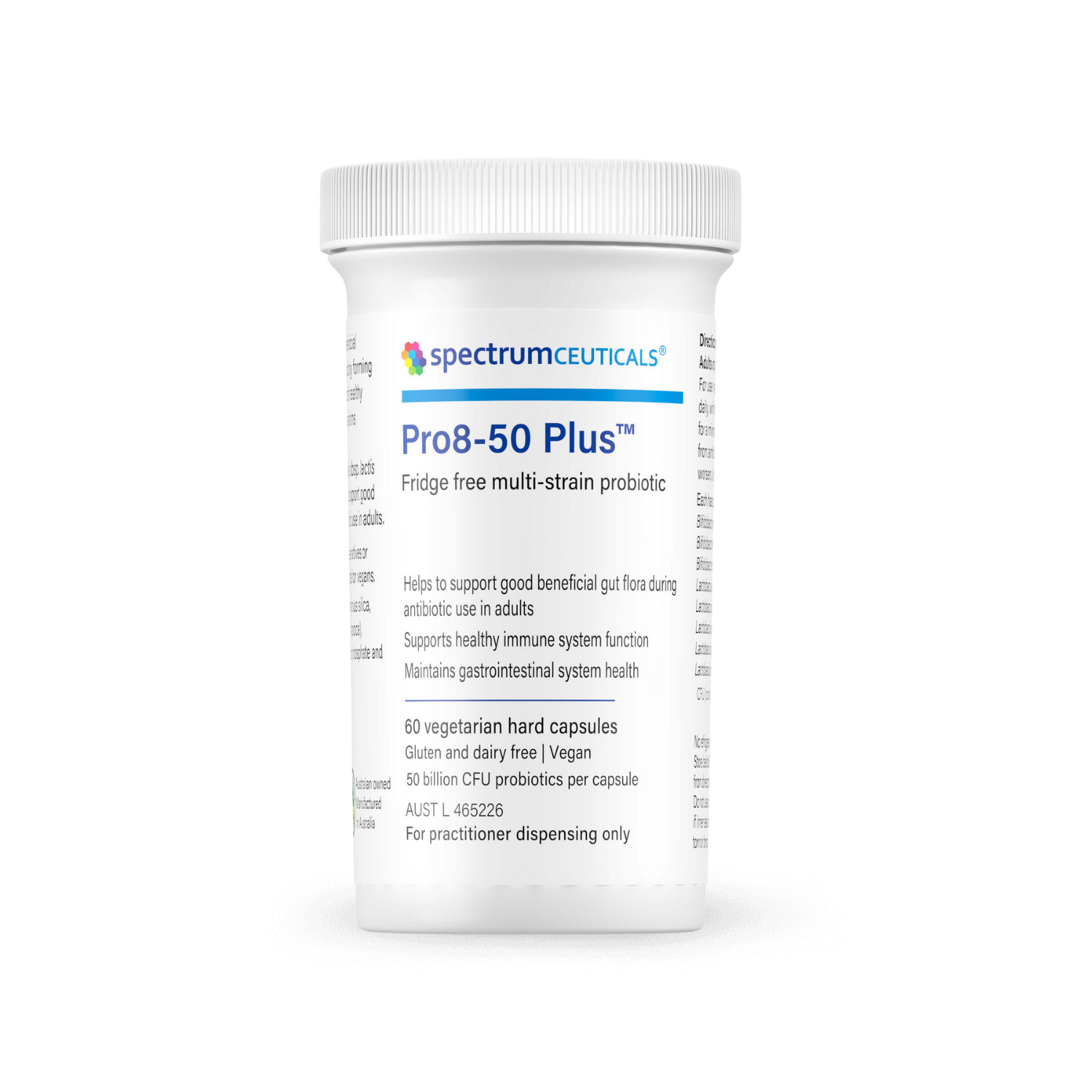 Pro8-50™ provides 50 billion CFU per capsule from eight beneficial probiotic strains to support gastrointestinal health and healthy immune system function. It contains Bifidobacterium animalis subsp. lactis and Lactobacillus rhamnosus GG, which help maintain beneficial gut flora during antibiotic use in adults.\