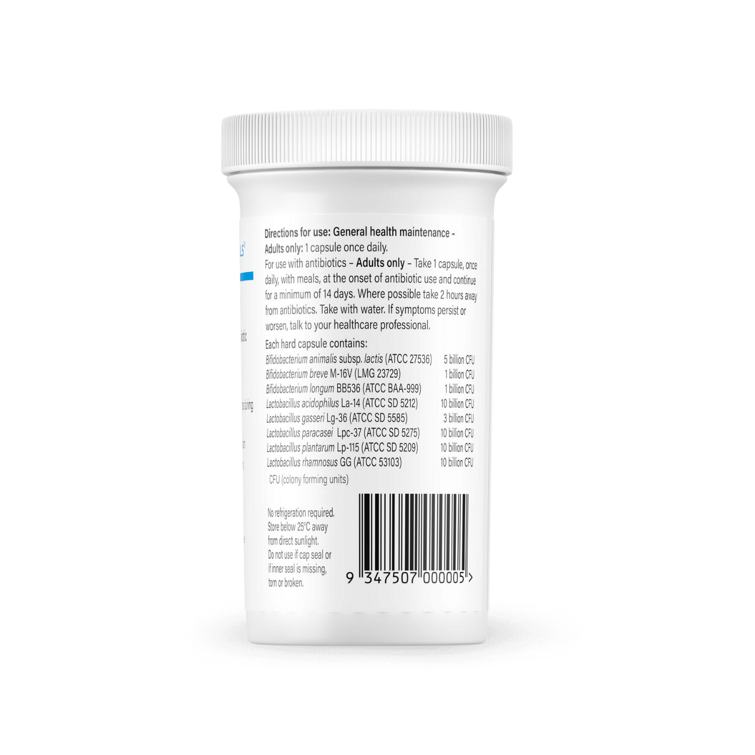 Each vegetarian hard capsule contains: Bifidobacterium animalis subsp. lactis (ATCC 27536) – 5 Billion CFU; Bifidobacterium breve M-16V (LMG 23729) – 1 Billion CFU; Bifidobacterium longum BB536 (ATCC BAA-999) – 1 Billion CFU; Lactobacillus acidophilus La-14 (ATCC SD 5212) – 10 Billion CFU; Lactobacillus gasseri Lg-36 (ATCC SD 5585) – 3 Billion CFU; Lactobacillus paracasei Lpc-37 (ATCC SD 5275) – 10 Billion CFU; Lactobacillus plantarum Lp-115 (ATCC SD 5209) – 10 Billion CFU; Lactobacillus rhamnosus GG (ATCC 53103) – 10 Billion CFU.
