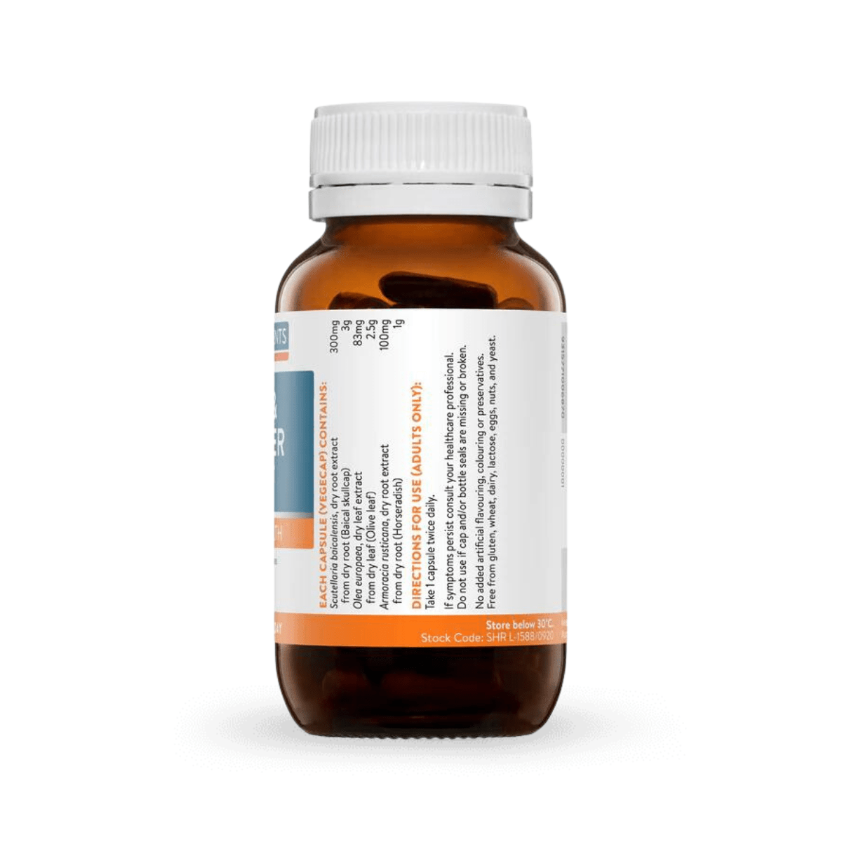 Scutellaria baicalensis, dry root extract 300mg from dry root (Baical skullcap) 3g, Olea europaea, dry leaf extract 83mg from dry leaf (Olive leaf) 2.5g, Armoracia rusticana, dry root extract 100mg from dry root (Horseradish) 1g