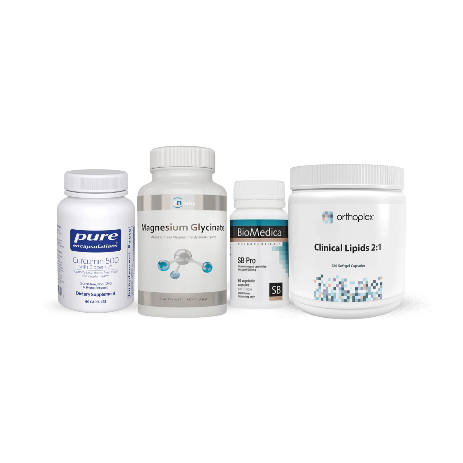 What’s inside (4 items): Orthoplex Clinical Lipids 2:1 • Curcumin 500 with Bioperine • RN Labs Magnesium Glycinate 180c • Biomedica SB Pro 60c.